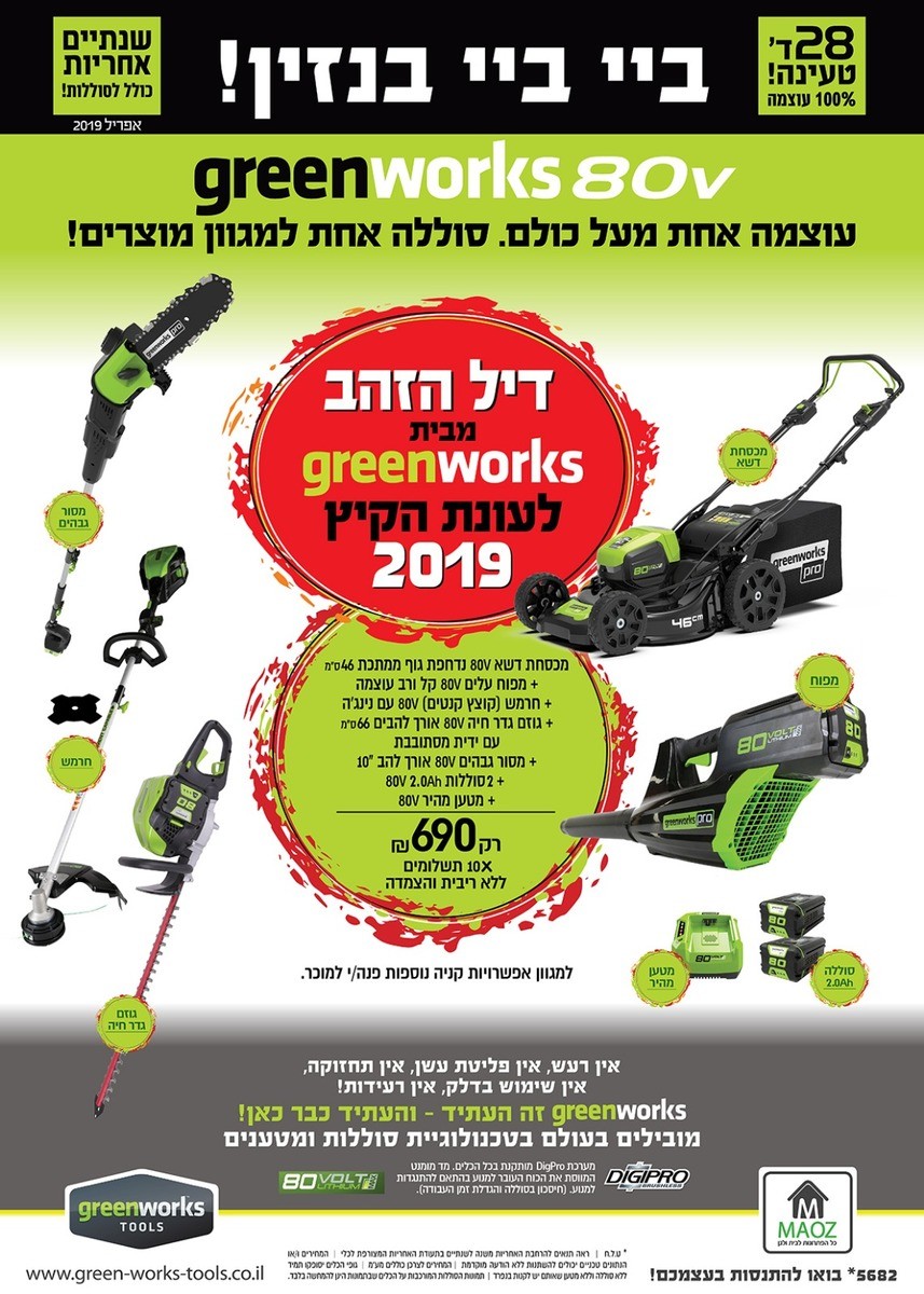 - מנוע מבוסס סוללת ליתיום 80V עוצמתית ביותר וללא שימוש בבנזין המאפשר מומנט חזק ביותר יחד עם פעולה שקטה